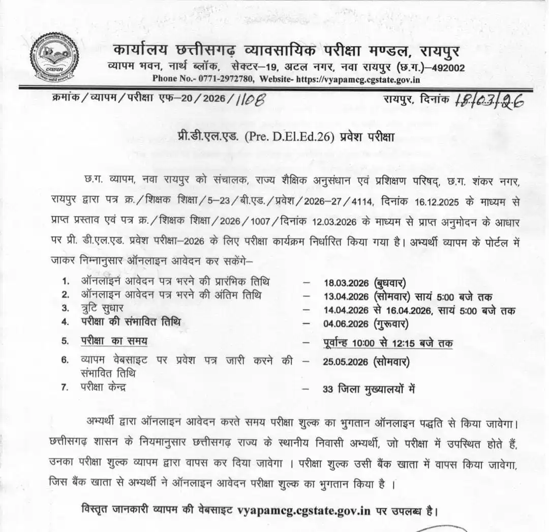 छत्तीसगढ़ व्यावसायिक परीक्षा मण्डल (CG Vyapam), रायपुर ने शैक्षिक सत्र 2026 के लिए Pre D.El.Ed (Diploma in Elementary Education) प्रवेश परीक्षा का आधिकारिक नोटिफिकेशन जारी कर दिया है। यदि आप छत्तीसगढ़ में शिक्षक बनने का सपना देख रहे हैं और प्राइमरी स्कूलों में पढ़ाने के लिए आवश्यक डिप्लोमा कोर्स करना चाहते हैं, तो यह आपके लिए एक सुनहरा अवसर है।